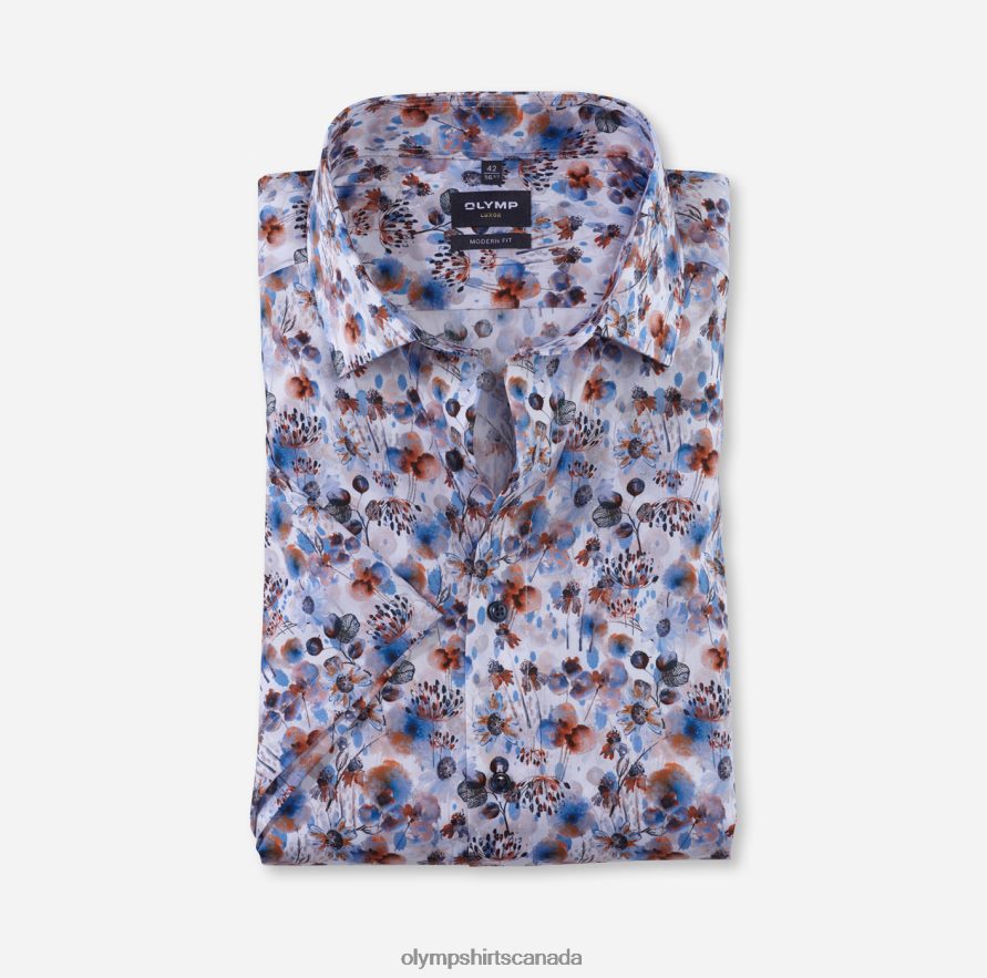 The OLYMP Luxor modern fit spring collection comes across as undeniably lively with this creative minimal print design with accents in the colour of the season, orange, and matte sheen cotton poplin. The cut is slightly tailored and close-fitting, without a breast pocket so as not to break up the sporty shape. Perfect for spring and summer - the airy short-sleeved version. A perfect match is the cosmopolitan Global Kent collar: Stylish, individual, OLYMP.